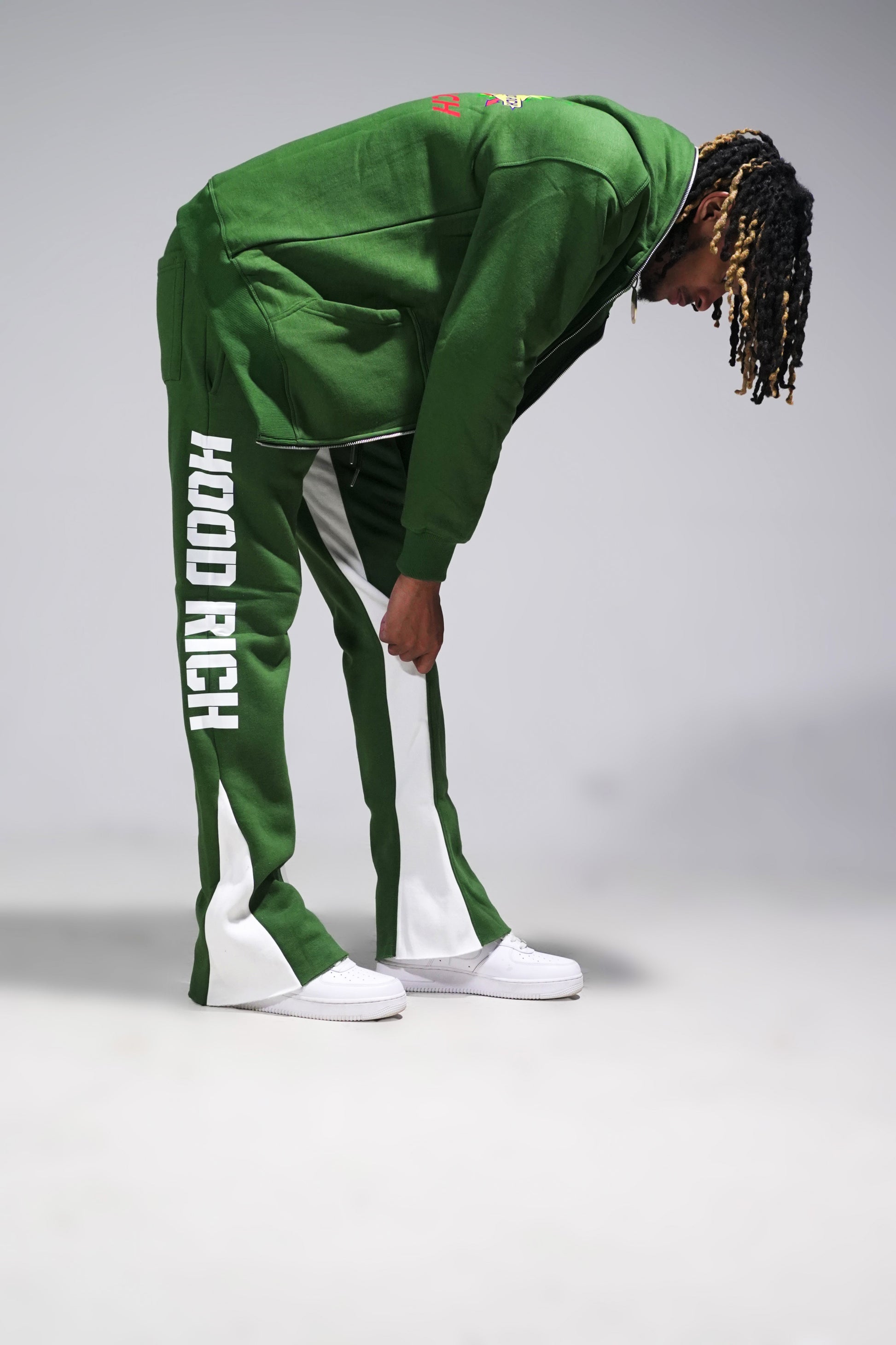 Green HoodRich Gas Station Flares (wide bottom) Also Comes With A Full Zip Hoodies With Logo On The Back!